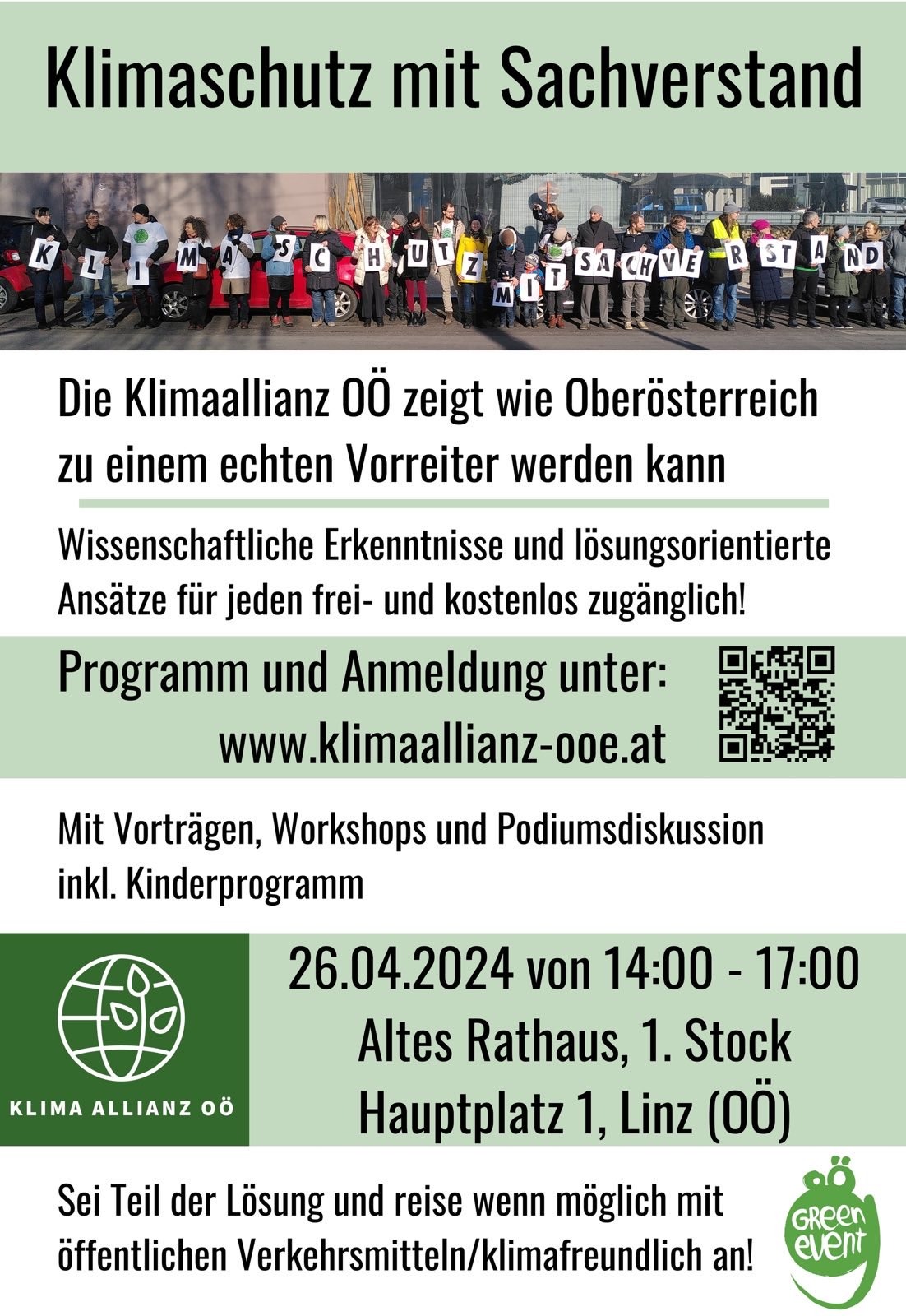 Diese Veranstaltung ist ein Green Event. Sei Teil der Lösung und reise wenn möglich mit öffentlichen Verkehrsmitteln / klimafreundlich an.